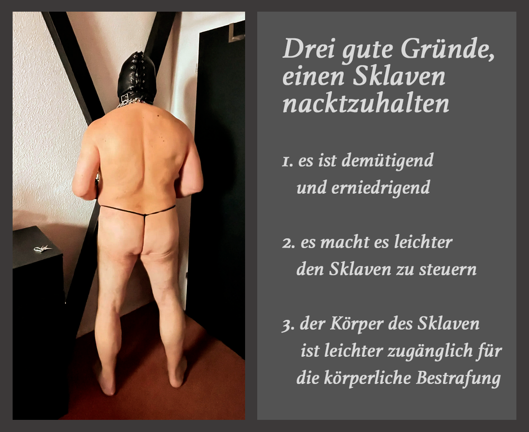 Damit erreiche ich bei Besuchern, dass sich mein Slave nie verstellen muss – egal ob nackt, bekleidet oder bereit, in Anwesenheit Anderer von mir bestraft zu werden.